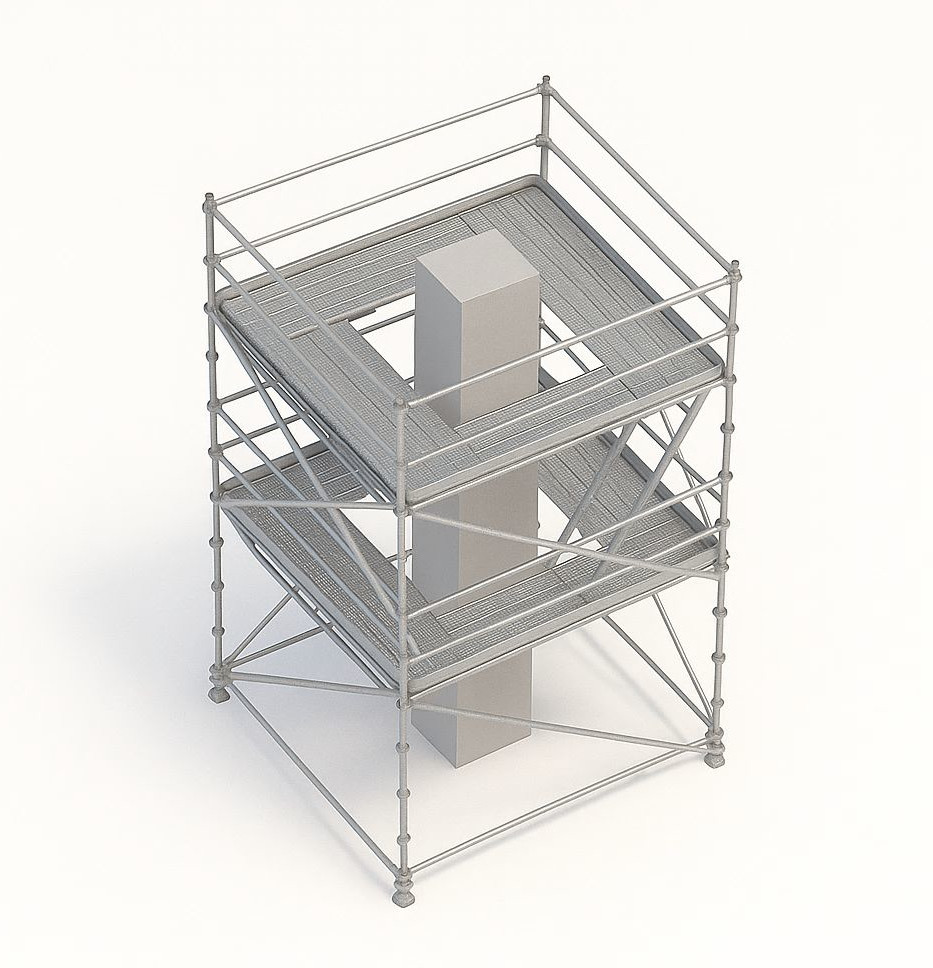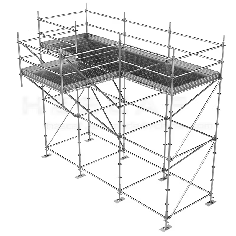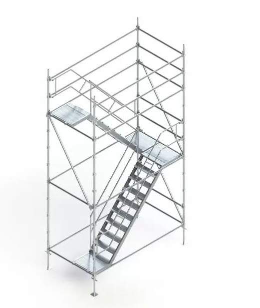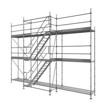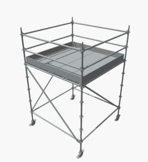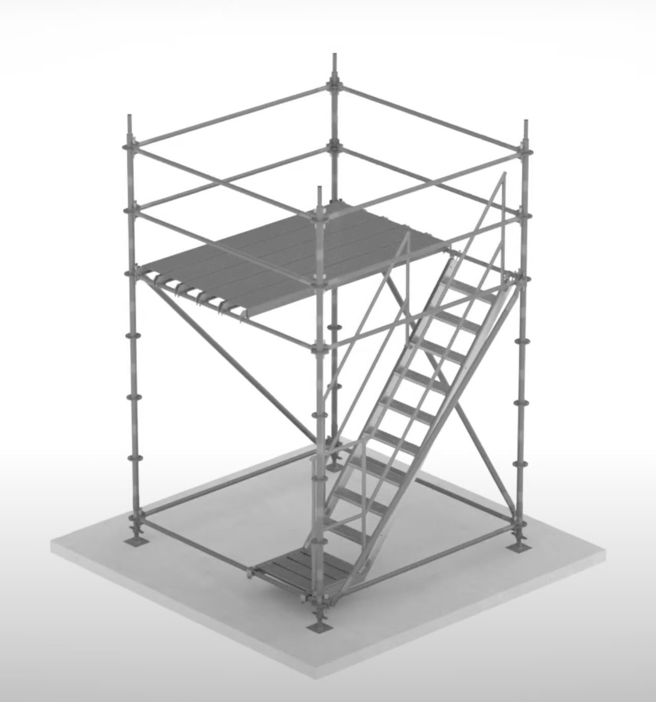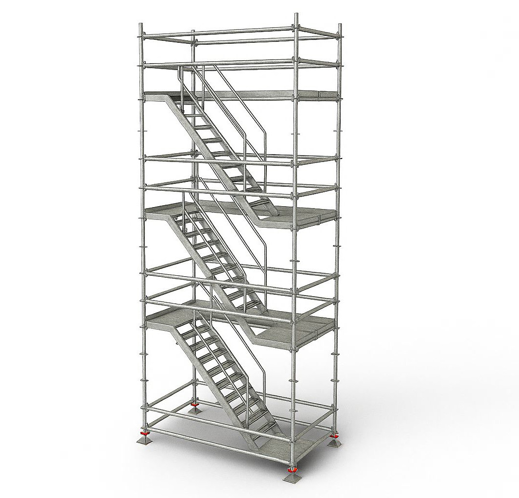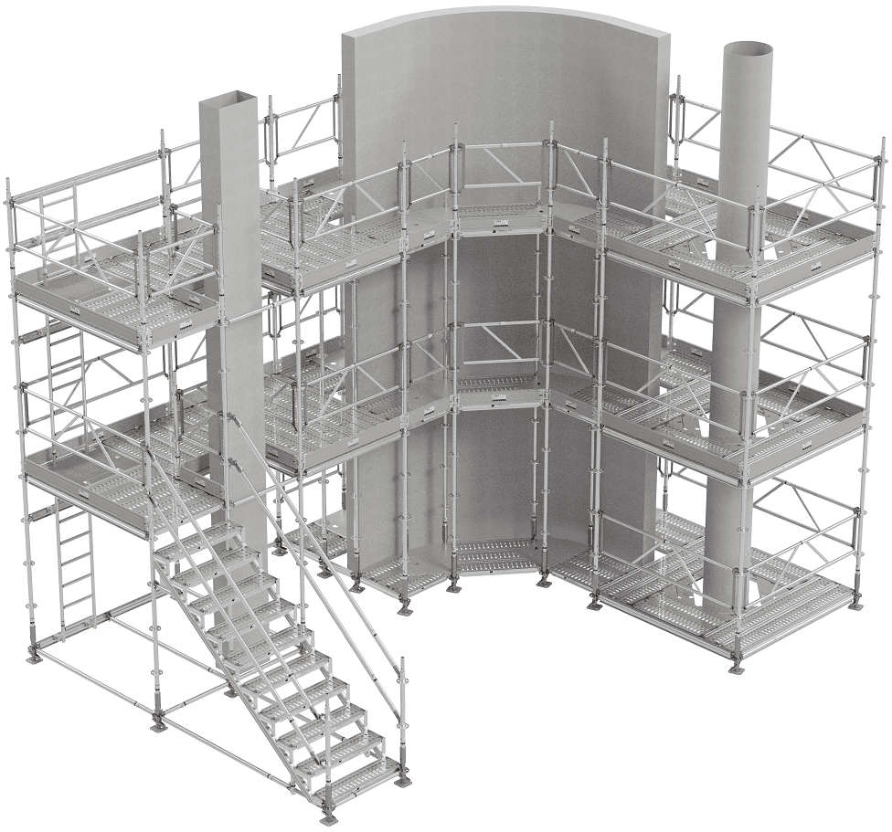Módulos de andamio como plataforma de trabajo, con barandas y torre de acceso exterior.