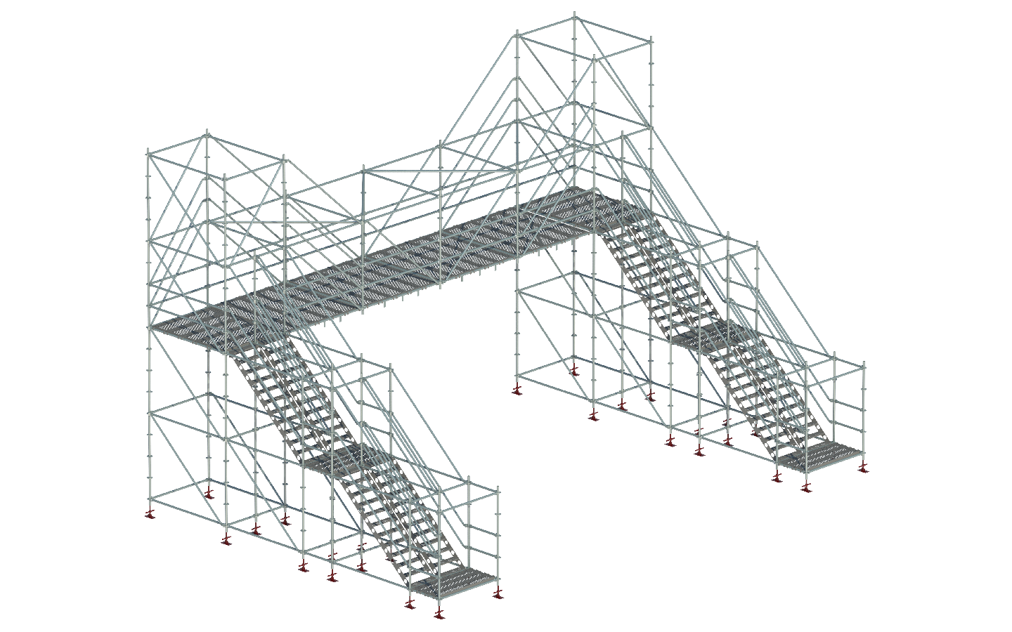 Plataforma de andamio de forma Puente Peatonal, con escaleras para acceso, pasamanos y barandas de protección.