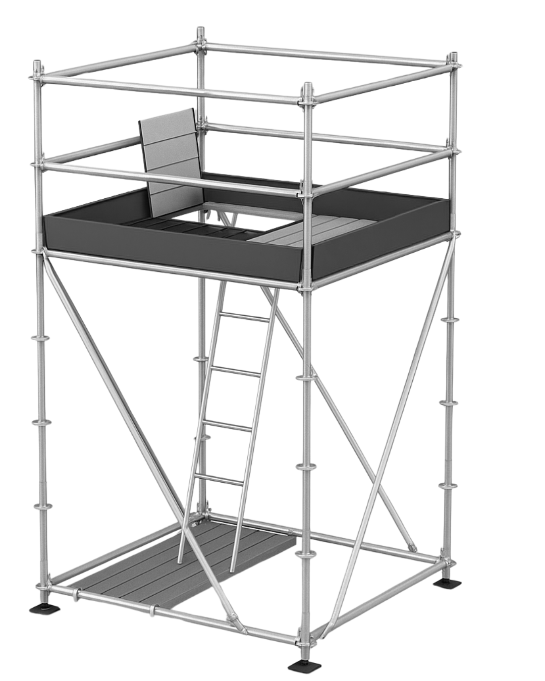 Módulo de andamio como plataforma de trabajo, con barandas y escalerilla interior para acceso.